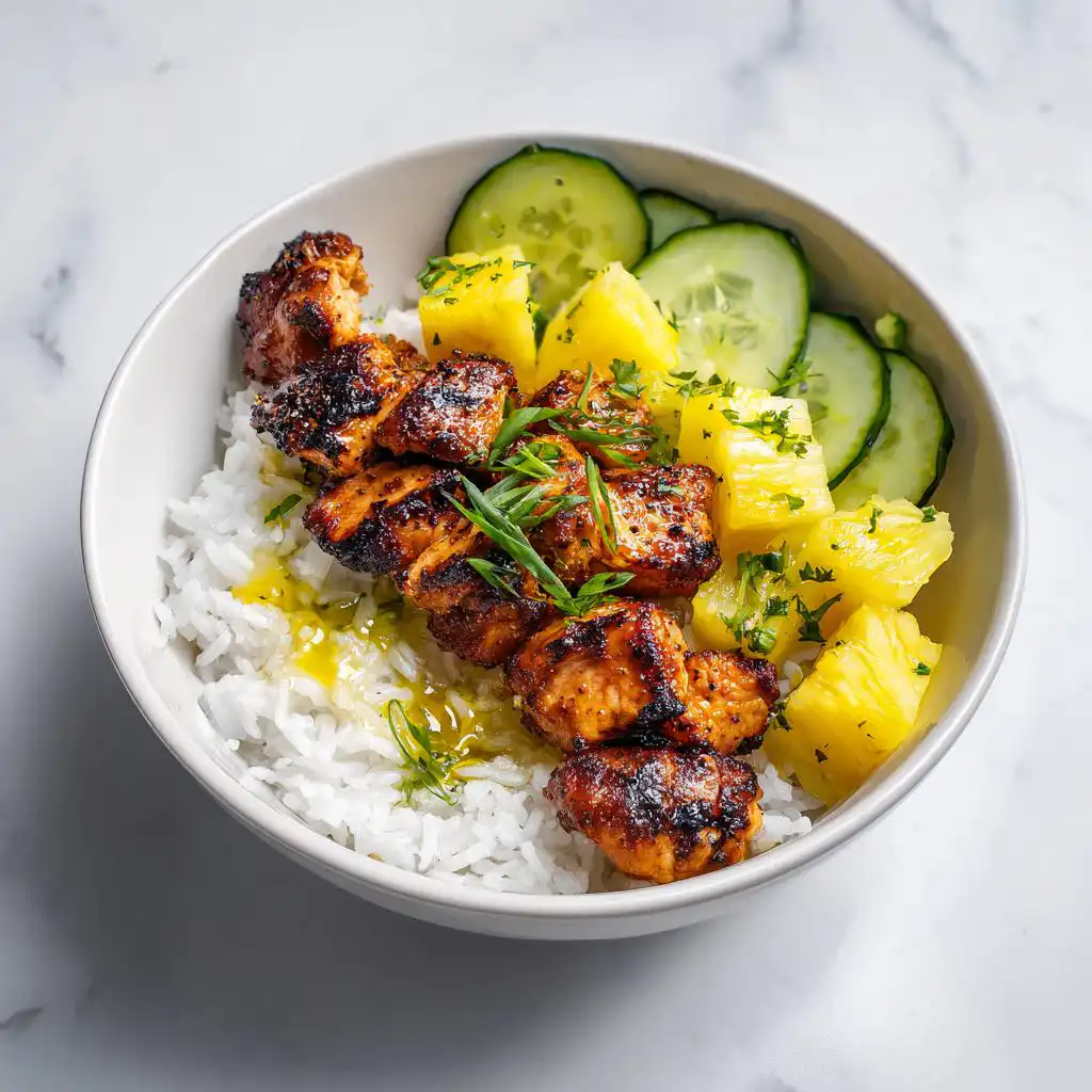- Assemble the bowl by placing the rice in the base. Top with the grilled chicken, pineapple chunks, and cucumber.