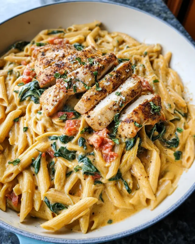 Same skillet, no need to wash it – all those browned bits equal flavor! Melt your butter and add the minced garlic. Oh, that smell! Cook just until fragrant (about 30 seconds – don’t let it burn!). Toss in your tomatoes and spinach, stirring until the spinach wilts. Now the magic happens – pour in that heavy cream and let it bubble gently. Stir in the Parmesan until it melts into the most luscious sauce you’ve ever seen. Too thick? That’s where your reserved pasta water comes in – just add a splash at a time until it’s perfect.
