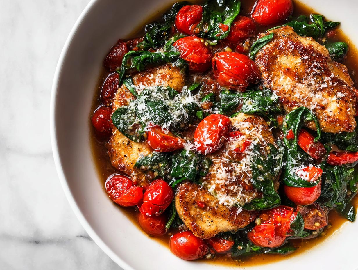 Once the broth reduces a bit, toss in your cherry tomatoes. Let them bubble away for about three minutes; you want them to soften up and start releasing their juices. Next, throw in that cup of spinach. It collapses on itself so fast, maybe 30 seconds of gentle stirring until it wilts completely. Finally, slide those rested chicken cutlets right back into the pan! Sprinkle that Parmesan cheese right over the top, give it one last little simmer for two or three minutes until the sauce thickens up just enough to coat the chicken beautifully. I love serving this right out of the skillet, topped with a little extra Parmesan and maybe some fresh basil if I have some growing on the patio. It’s an absolute dream for a busy weeknight dinner! You can find some other easy chicken dinner ideas here, too.