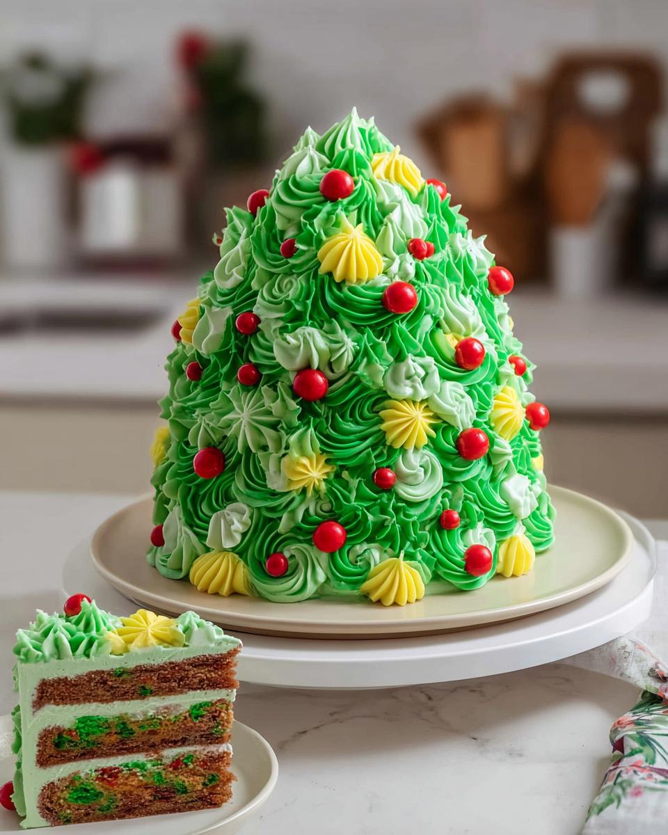 - The marbled spice cake layers – I use two shades of green batter swirled together, so when you slice it open? Gorgeous marbling that tastes like Christmas morning with all those warm spices.