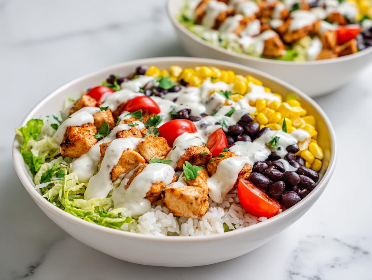 - In your serving bowl, layer the rice or cauliflower rice, diced chicken, black beans, corn, cherry tomatoes, and lettuce.