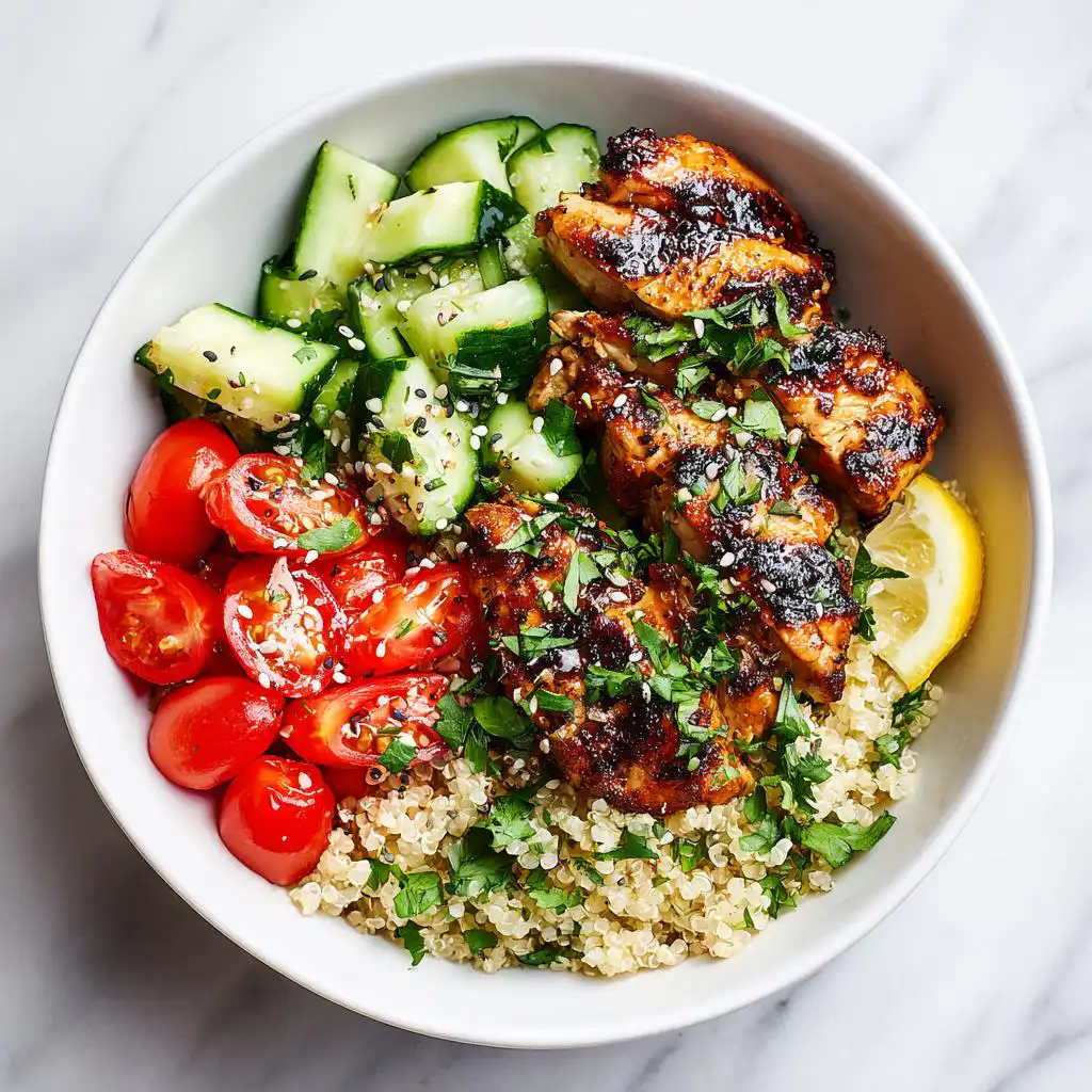 You absolutely can! Keeping the structure of this Healthy Chicken Lunch Bowl but making it totally plant-based is super straightforward. Just skip the grilled chicken, obviously! Instead, I recommend swapping in about one cup of roasted chickpeas or perhaps some firm tofu that you’ve marinated in soy sauce and maybe a little smoked paprika. That way you still get that fantastic protein punch to keep you satisfied until dinner.
