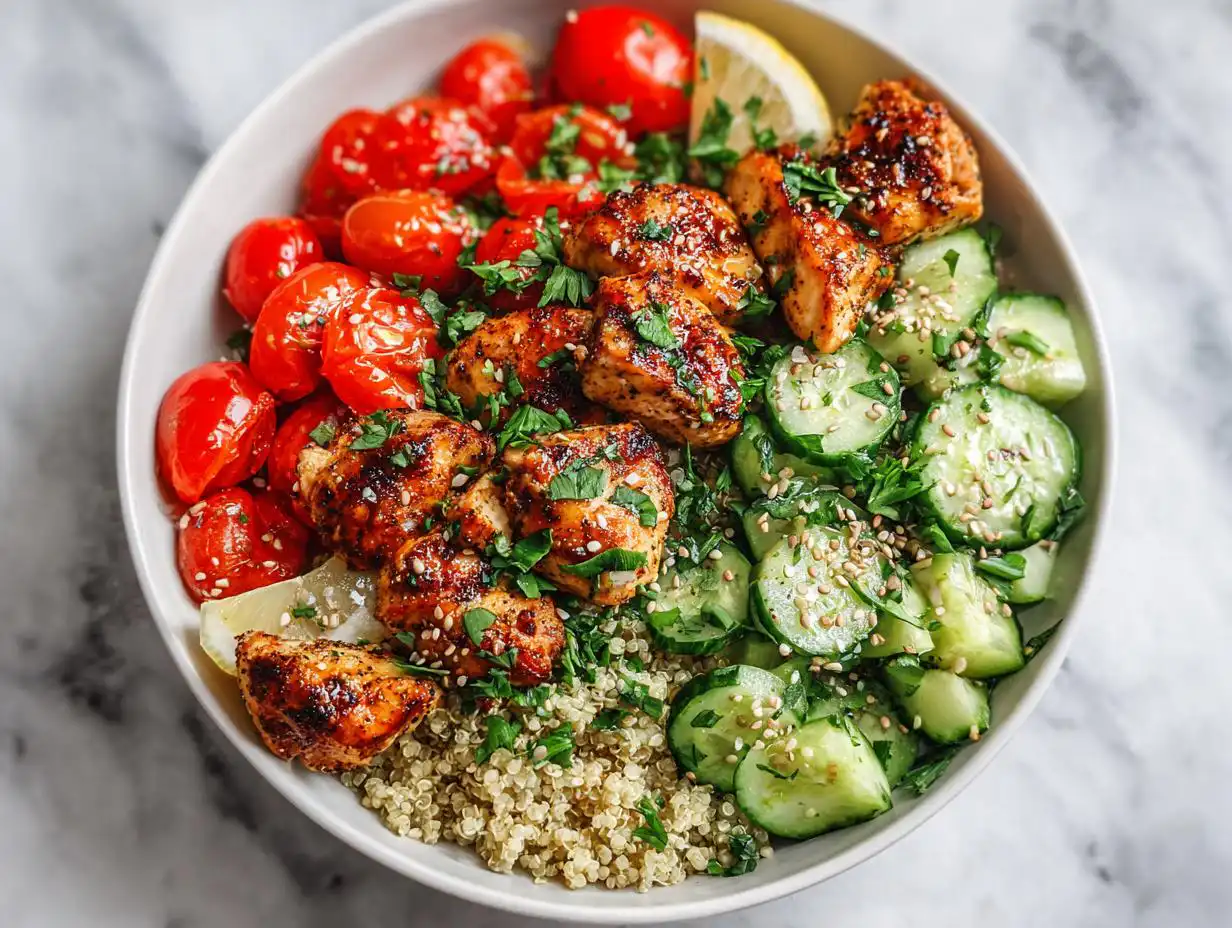 Oh, you know those days, right? When 1 p.m. hits and you realize you haven’t thought about lunch once, and the only thing you have on hand is maybe some sad leftovers? I swear, weekday meals used to derail my whole afternoon! That’s why I’m obsessed with keeping things super simple but still genuinely tasty. Fresh ingredients made this bowl light yet satisfying, which is exactly what you need when you’re trying to power through the afternoon without crashing. This recipe became my go-to—it’s seriously the ultimate, simple Healthy Chicken Lunch Bowl. As someone who focuses on balanced meals that actually taste great, I promise you, this one checks all the boxes. It’s clean, quick, and you probably have most of the stuff already!
