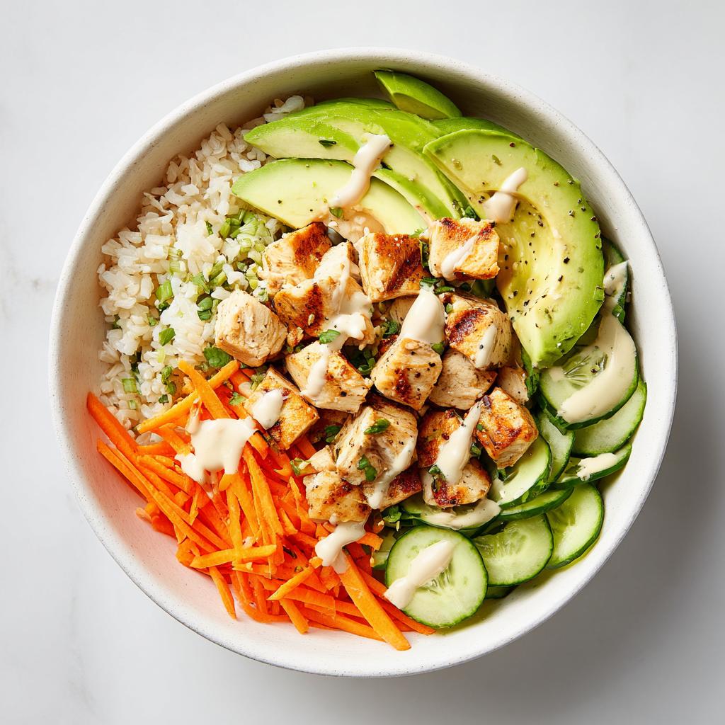 - Assemble your serving bowl by layering the brown rice, grilled chicken, avocado, cucumber, and shredded carrots.