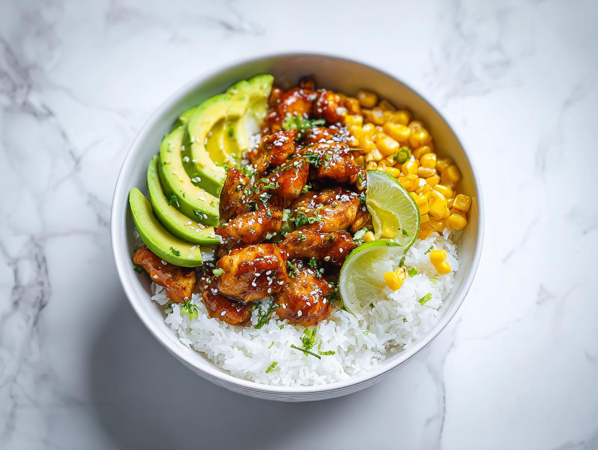 While the chicken is searing, cook your 1 cup of rice according to whatever method works best for you. Once the rice is done, it’s time for the fun part! Layer the bottom of your bowl with the warm rice base. Then artfully arrange your cooked, sweet tangy chicken over the top. Add your fresh elements—the sliced avocado and that sweet corn. I like to drizzle just a tiny bit more lime juice over the whole thing at the very end for an extra zing before garnishing. If you want the full guide, stop by the summer rice bowl with chicken post!