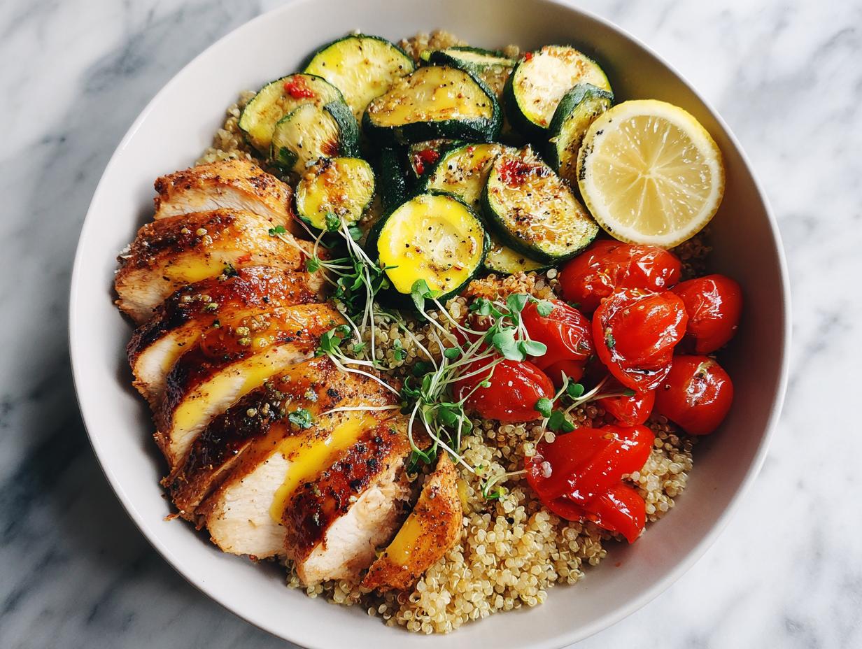 You really shouldn’t worry! The seasoning is intentionally minimal—just salt and pepper. That’s because the dressing at the end is doing all the heavy lifting. The olive oil and fresh lemon juice soak into the warm roasted veggies and the quinoa, locking in flavor. If you wanted a tiny extra boost, you could rub the zucchini with just a whisper of garlic powder before roasting, but seriously, for a healthy summer chicken plate, keeping the veggies simple lets that fresh lemon shine.