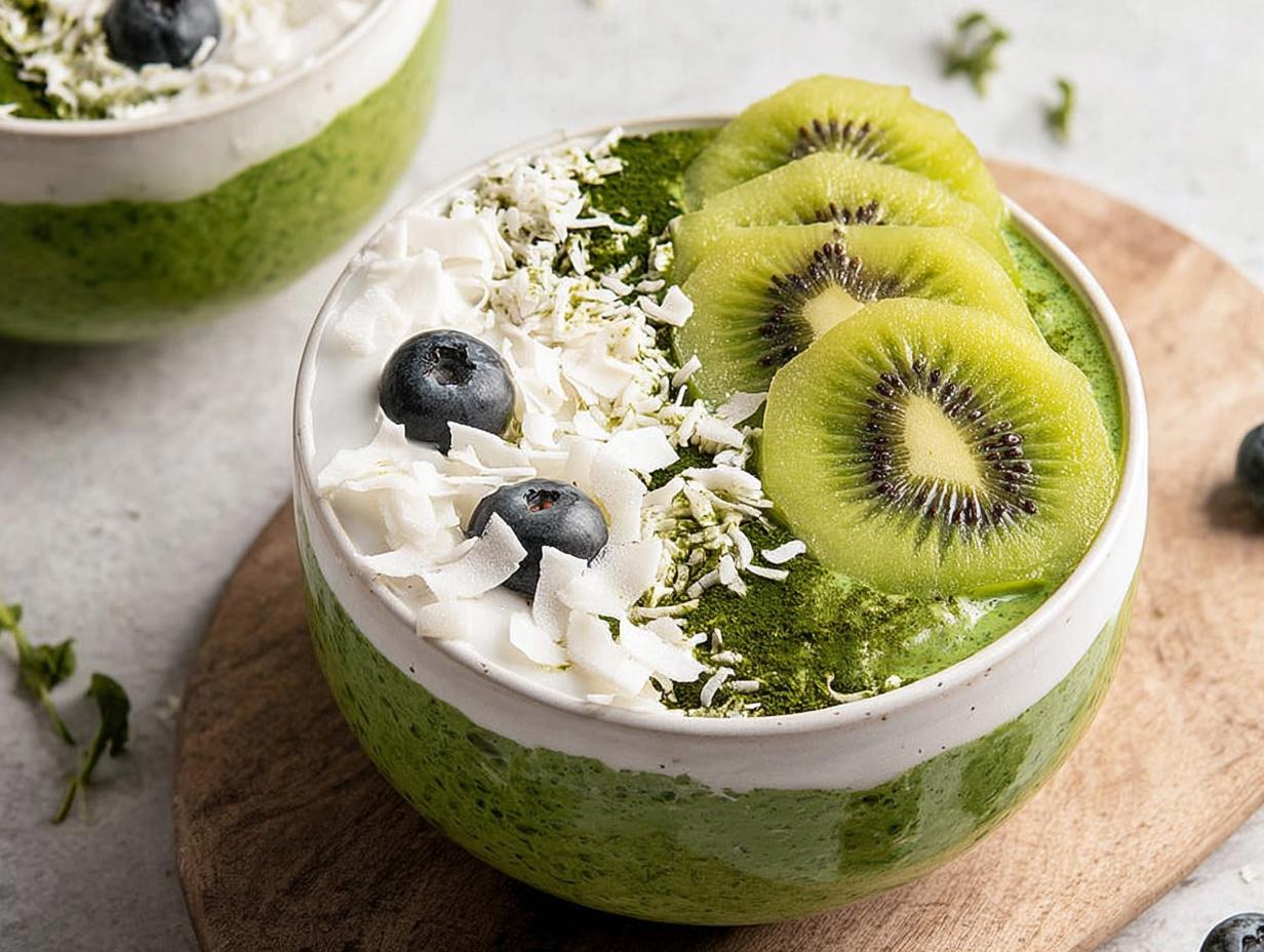 - Top with kiwi slices, a pinch of coconut flakes, and a light dusting of matcha for presentation.