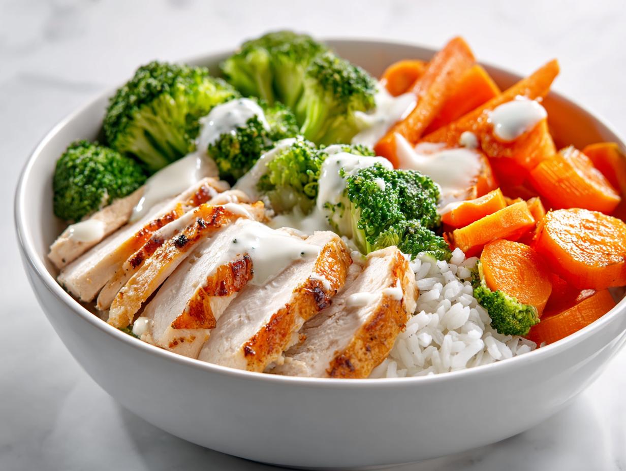 Please remember, this is just a rough estimate based on standard USDA values for cooked chicken breast, white rice, and basic vegetable portions. If you go heavy on the oil during roasting, or if you use a full-fat yogurt sauce versus a non-fat one, those numbers will shift slightly. These are just benchmarks so you know roughly what kind of fuel you’re packing for your week!