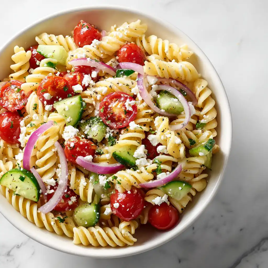 My biggest tip is that rinsing the pasta well with cold water (which we already talked about!) is key to preventing sogginess during transport. Also, if you are worried about the feta getting too soft, you can always tuck it in right before serving. When you pull it out of the cooler, give it one final gentle toss—never stir vigorously!