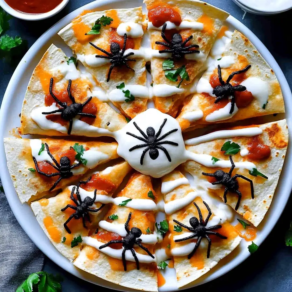 The design is where you can really let your creativity shine. Instead of just one big web, try making mini quesadillas and decorating each one differently—kids love having their own personal spider web snack. You can also use colored tortillas (like spinach for green or tomato for red) to make the webs pop even more. For an extra spooky touch, serve your quesadillas alongside a bowl of guacamole “slime” or salsa “blood” for dipping.