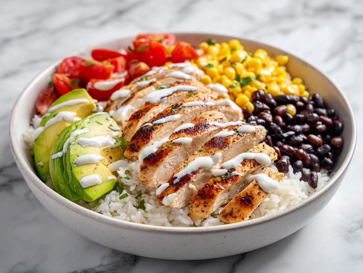 Okay, get ready for the colorful payoff! Grab your serving bowls. I like to create little sections rather than just mixing everything together—it looks prettier and you control the bite you take next. Start with a bed of warm rice on one side. Then, section off spots for your black beans, corn, sliced chicken, tomatoes, and that gorgeous avocado. Finally, take that zesty yogurt sauce and drizzle it right over the whole thing. Garnish with a little cilantro if you have some, and get ready to dig in right away! For another great take on this concept, check out this version from the pros: chicken burrito bowl.