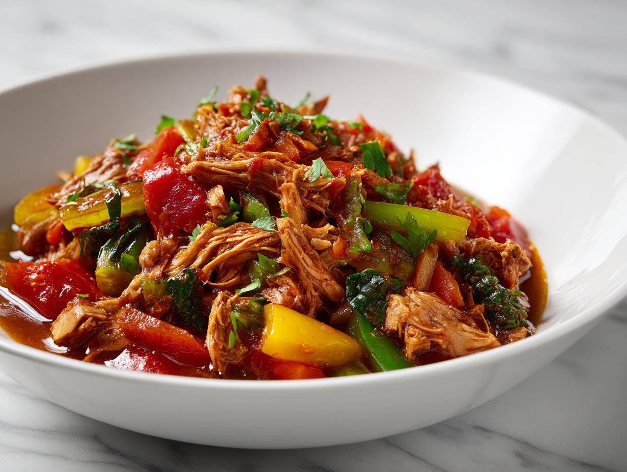 When the time is up, use two forks to pull apart the chicken right in the pot—it should shred like butter! Give the remaining liquid and veggies a gentle stir to combine it all nicely. Then, serve it immediately in a bowl. I always finish this off by sprinkling some fresh parsley or basil on top. It just wakes up the flavors beautifully before you dig in. Enjoy!