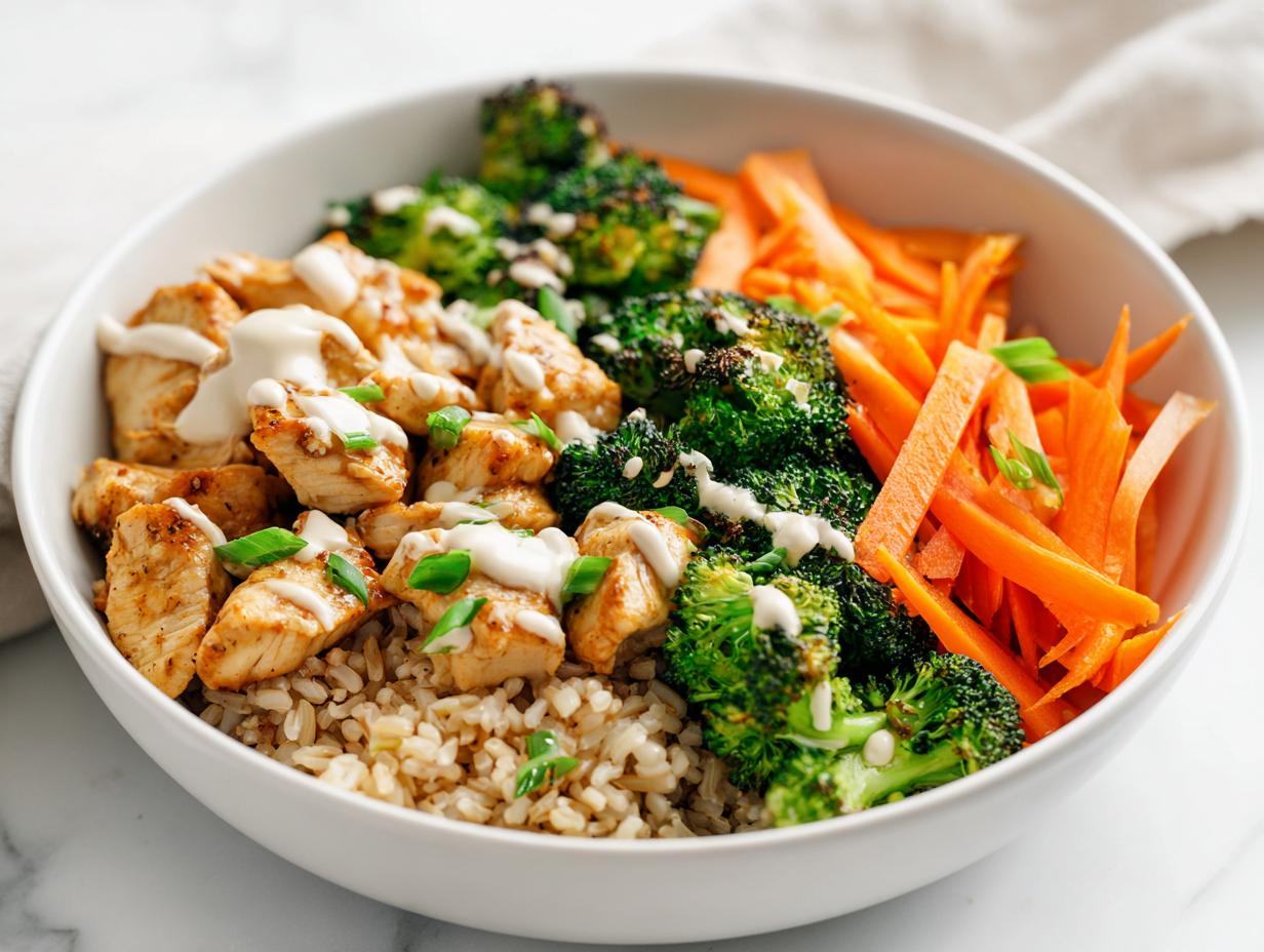 You absolutely can! The base of rice, roasted carrots, and broccoli is perfect. For the protein swap, chickpeas or cubed, seasoned tofu work beautifully. I’d suggest roasting the tofu along with the vegetables so it gets nice and firm. Just make sure you use a vegan yogurt for the dressing to keep it 100% plant-based!