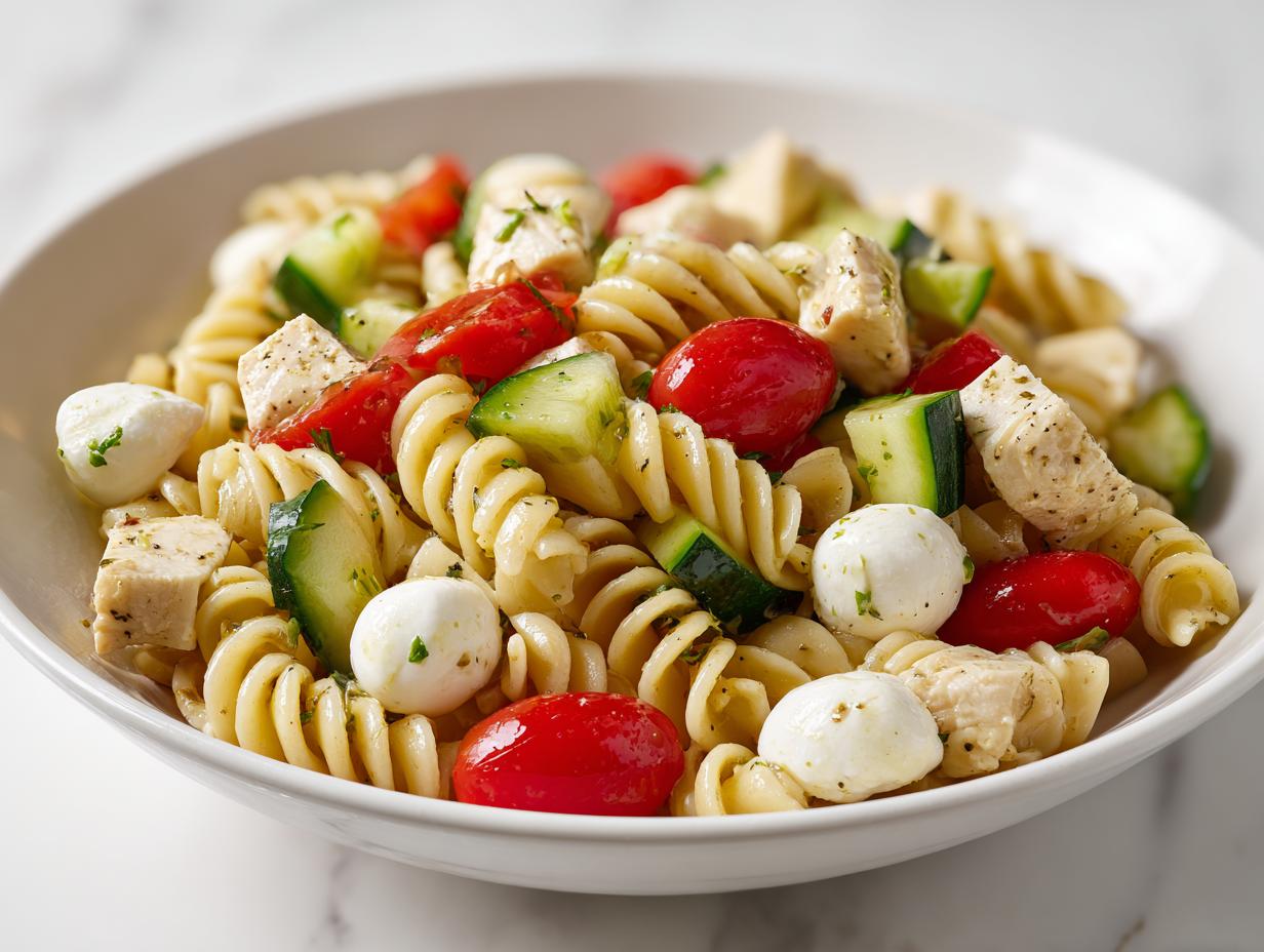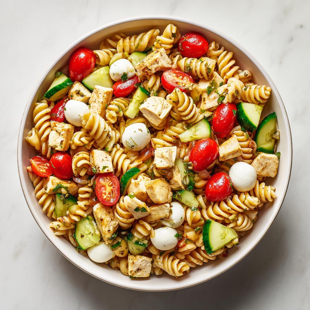 Absolutely! You can easily turn this into a fantastic vegetarian pasta salad. Just skip the chicken and bulk up on the veggies! I’d recommend doubling the mozzarella balls or adding chickpeas—maybe toss in some chopped bell peppers too. Since you are missing the protein density of the chicken, adding an extra cup of veggies or beans keeps it feeling like a hearty meal. You can learn more about how to pack healthy flavor into dishes like this over at this post about avocado chicken salad!