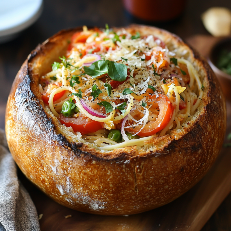 Vegetarian Spaghetti Primavera Bread Bowl
